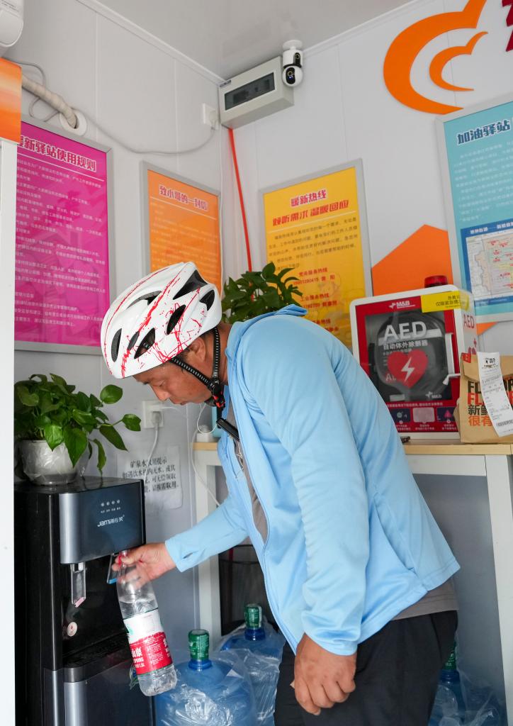 6月25日,一名外卖员在北京市东城区崇外街道一处“暖新驿站”接饮用水。