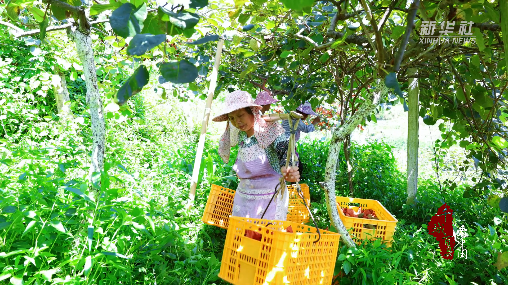 走进福建省泉州市德化县浔中镇的红阳猕猴桃种植基地,连片藤蔓间缀满饱满果实,果农正忙着采摘,一派丰收盛景。