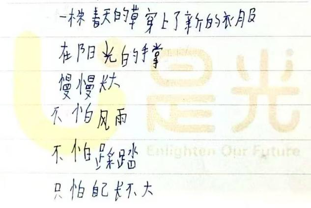 于是,江波开始在诗歌课上认真写字,因为“想让诗变得更美”。很快,这样的改变也出现在了他的作业上、试卷上。杨老师欣喜地描述江波的进步:上诗歌课的一年时间内,他从一个不会拼音、字迹潦草的孩子,实现了语文成绩从D到A的跨越。更重要的是,他找到了表达自我的勇气——快乐时写诗,忧愁时也写诗。他把自己坦然地在诗歌本上摊开,诗歌成了他舒展情绪、表达内心的方式。