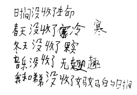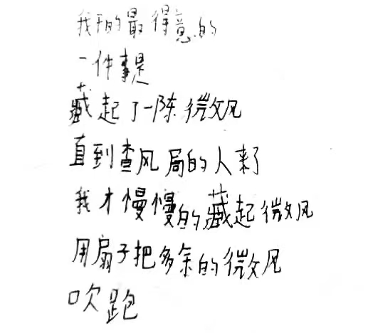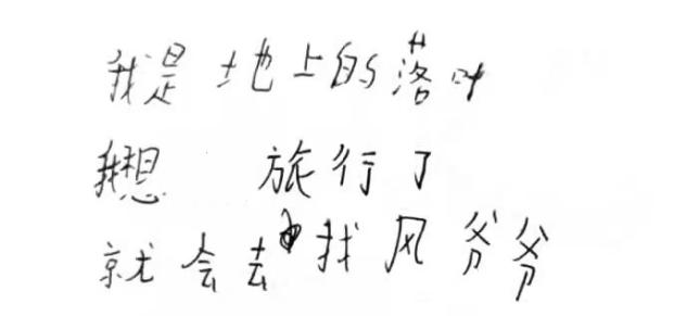 转变始于一堂诗歌课。当其他孩子犹豫着不知如何下笔时,江波却在那节课里写出了三首诗。不论在诗歌课上还是课堂之外,江波总有各种写诗的灵感:他天真地写“我不爱数学”,细腻地记录“落叶的旅行”,甚至捕捉到了“微风的踪迹”。这个孩子所有的思绪和情感都变成生动的诗句,在一页页纸上舒展、跳跃。在诗歌里,他被真诚地“看见”了——不是作为一个成绩不理想的学生,而是作为一个敏锐、柔软、充满想象力的个体。