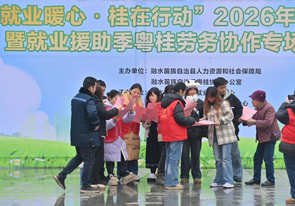 2月8日,在柳州市融水苗族自治县粤桂劳务协作专场招聘会上,人们在了解岗位需求信息。