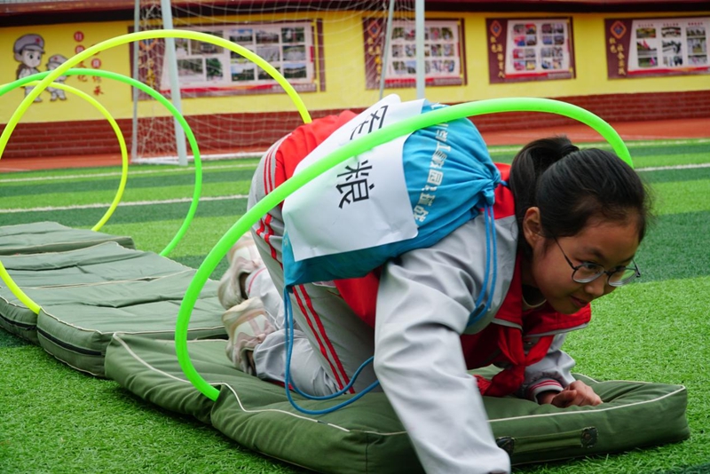 “‘小红军’们,背上‘军粮’,往前冲!”在通江李先念红军小学的操场上,六年级三班的同学正在上一堂有趣的体育课。体育老师向阳带着同学在操场玩自己设计的游戏“送军粮”。扮演“小红军”的同学们背上“军粮”后,依次完成“穿越草丛”“翻越夹金山”“过草地”和“投掷手榴弹”四个项目。