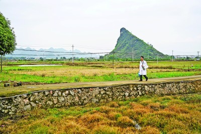 在广西钟山县石龙镇松桂村,乡村医生行走在出诊路上。新华社发