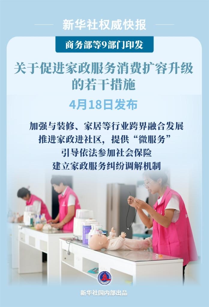 商务部等9部门近日印发关于促进家政服务消费扩容升级的若干措施,4月18日对外发布。一系列举措围绕提升家政服务供给质量、促进家政服务便利消费、完善家政服务业支持政策、优化家政服务消费环境等4方面展开,促进家政服务消费扩容升级。