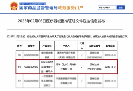 据国家药品监督管理局官网信息,2月3日,由数坤(北京)网络科技股份有限公司(下称“数坤科技”)子公司语坤(北京)网络科技有限公司研发的冠状动脉CT血流储备分数计算软件(Shukun-FFR)正式获批NMPA三类医疗器械注册证。该软件可全自动评估冠状动脉血管任意位置血流储备分数,是数字人体技术助力临床辅助诊断在临床准入的又一重大突破。