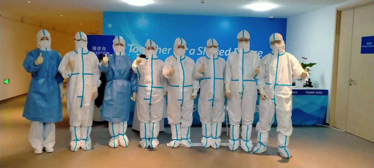 因为疫情防控需要,医疗志愿者工作的时候要穿着防护服和隔离衣,北京冬奥会医疗志愿者、北京康复医院康复治疗师许莹娟说:“刚开始的时候,我穿一会儿就缺氧,现在持续穿戴四五个小时还能为大家进行治疗。别看外面冰天雪地,我们在防护服里已经是大汗淋漓了。”