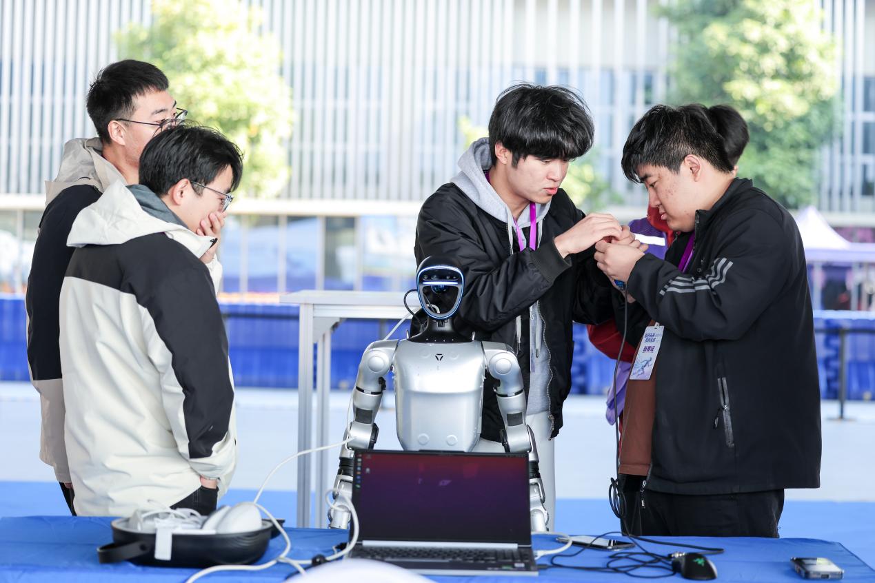 参赛队员围在人形机器人旁研讨细节,为赛事做赛前调试准备。新华网发(大赛组委会供图)