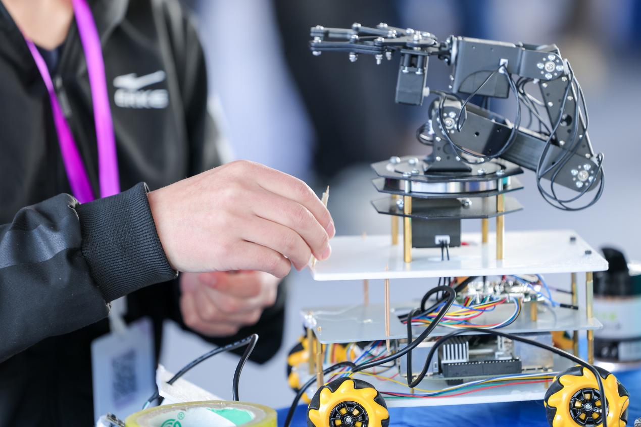 选手调试参赛的机械臂机器人,备战高精度工业装配项目竞技。新华网发(大赛组委会供图)