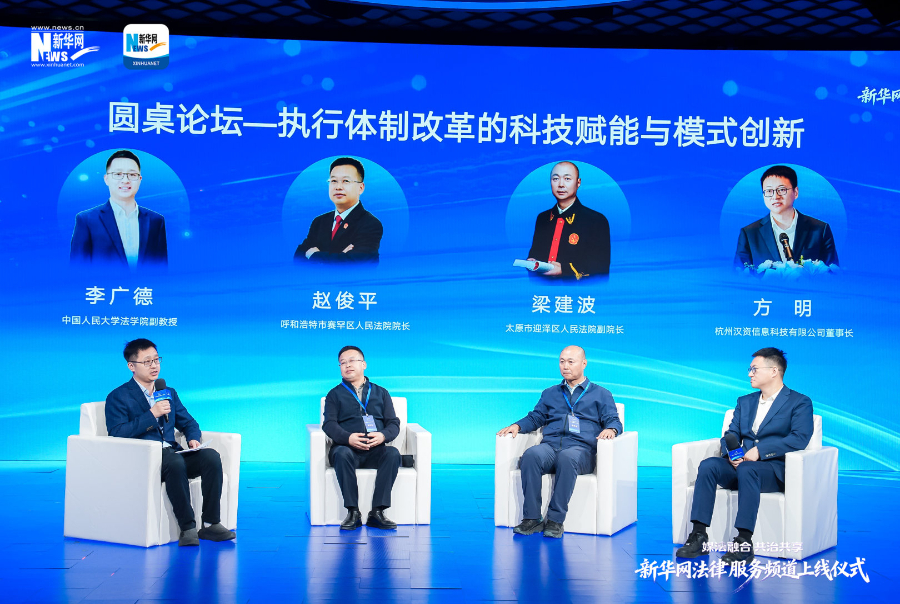 《执行体制改革的科技赋能与模式创新》圆桌论坛环节,由中国人民大学法学院副教授李广德主持,呼和浩特市赛罕区人民法院院长赵俊平、太原市迎泽区人民法院副院长梁建波、杭州汉资信息科技有限公司董事长方明围绕主题进行深入交流。