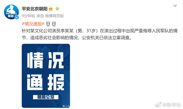 据@平安北京朝阳 ,针对某文化公司演员李某某(男,31岁)在演出过程中出现严重侮辱人民军队的情节,造成恶劣社会影响的情况,公安机关已依法立案调查。