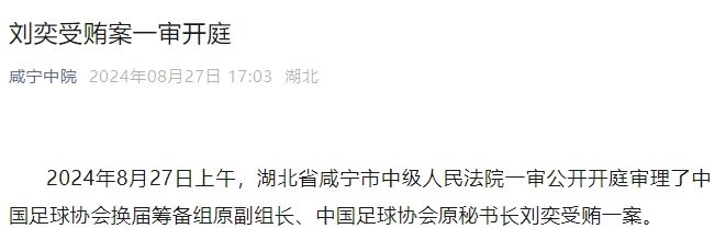 2024年8月27日上午,湖北省咸宁市中级人民法院一审公开开庭审理了中国足球协会换届筹备组原副组长、中国足球协会原秘书长刘奕受贿一案。