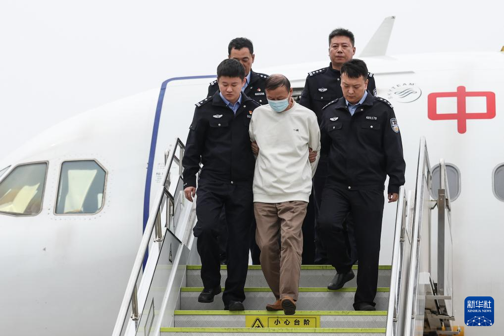 4月3日在沈阳桃仙国际机场拍摄的被押解回国的犯罪嫌疑人王某某(中)。新华社记者 潘昱龙 摄
