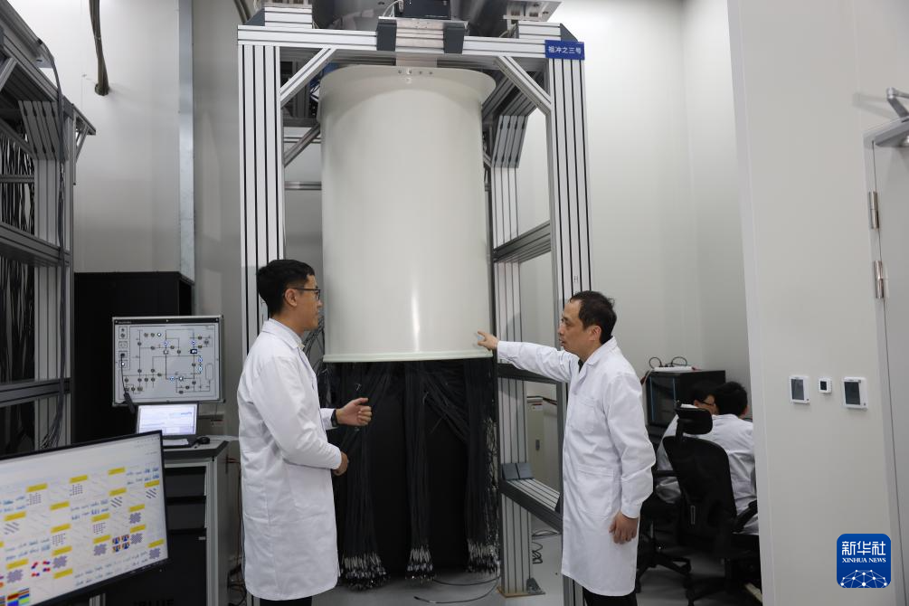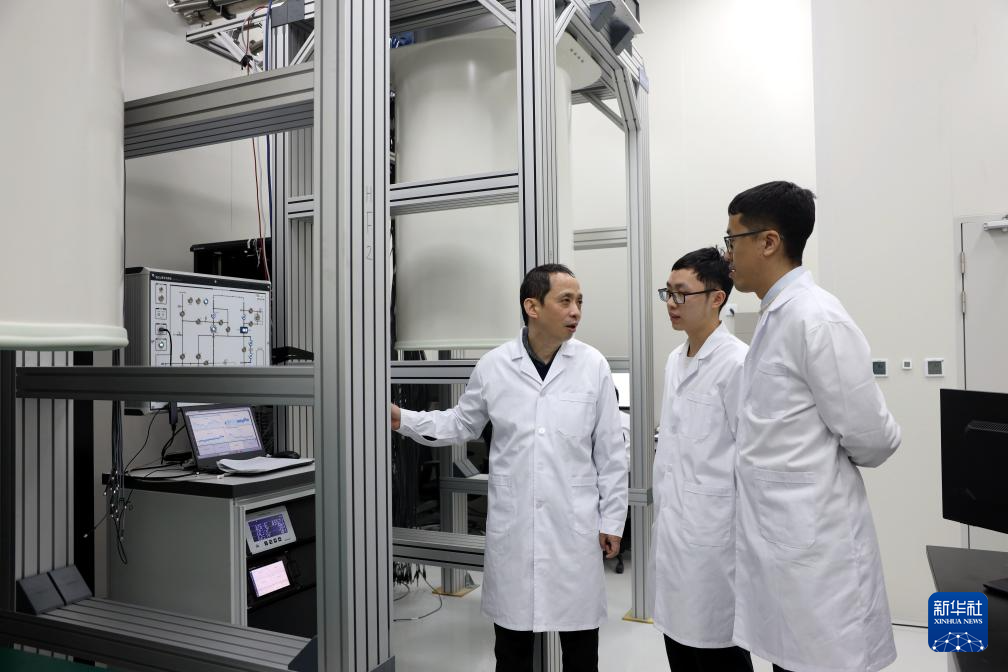 3月3日,中国科学技术大学教授、“祖冲之号”量子计算总师朱晓波(右)与学生讨论制冷机状态。新华社发(代蕊摄)