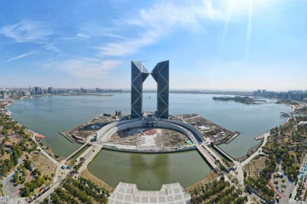 这是2025年3月19日拍摄的位于上海浦东新区的自贸区临港新片区滴水湖畔的西岛中银金融中心项目建设工地(无人机照片)。新华社记者方喆摄