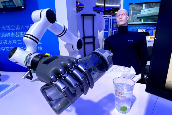 3月27日在2026中关村论坛年会展览上拍摄的“北脑一号”智能脑机系统启动机械臂往杯里倒水。新华社记者 魏梦佳 摄