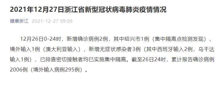 12月26日0-24时,新增确诊病例2例,其中绍兴市1例(集中隔离点检测发现)、境外输入1例(澳大利亚输入),新增无症状感染者3例(其中西班牙输入2例,乌干达输入1例),已排查密切接触者均已实施集中隔离。截至26日24时,累计报告确诊病例2006例(境外输入病例295例)。