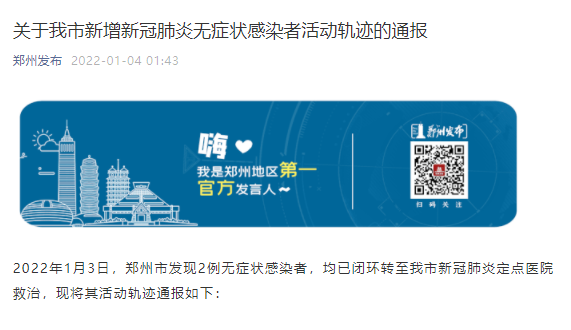 2022年1月3日,郑州市发现2例无症状感染者,均已闭环转至该市新冠肺炎定点医院救治,现将其活动轨迹通报如下:
