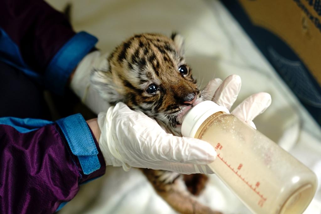 2021年12月24日,上海动物园饲养员给一只华南虎幼崽喂奶。新华社记者 张建松摄