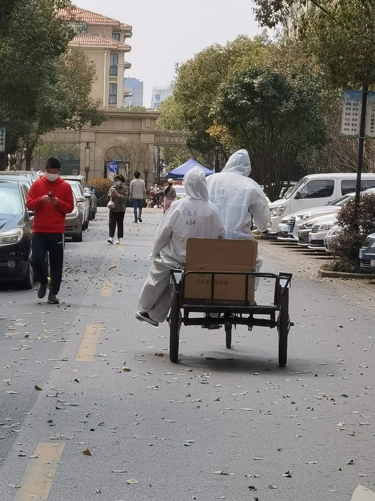 戚可说:“疫情隔远了居民间的距离,但拉近了人心。小推车、电动车、人力三轮车……志愿者们自发拿出了各家的工具,帮助居民运送货物。疫情让大家团结在一起,小区也更有家的感觉。”