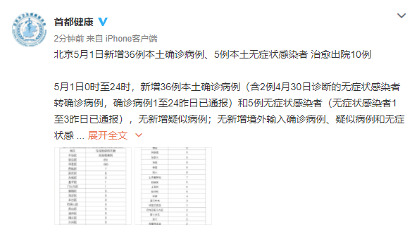 原标题:北京5月1日新增36例本土确诊病例、5例本土无症状感染者 治愈出院10例