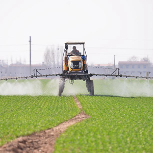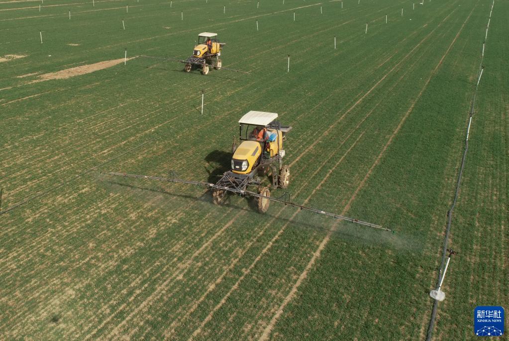 3月14日,河北省晋州市槐树镇北白水村一家农业合作社的社员在操作机械设备给冬小麦喷洒农药。 新华社记者 杨世尧 摄