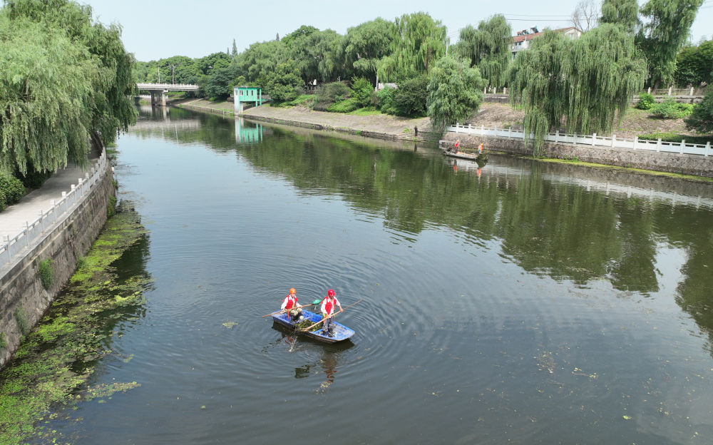 工作人员在湖州市吴兴区埭溪镇进行河道保洁(6月21日摄,无人机照片)。新华社记者 翁忻旸 摄
