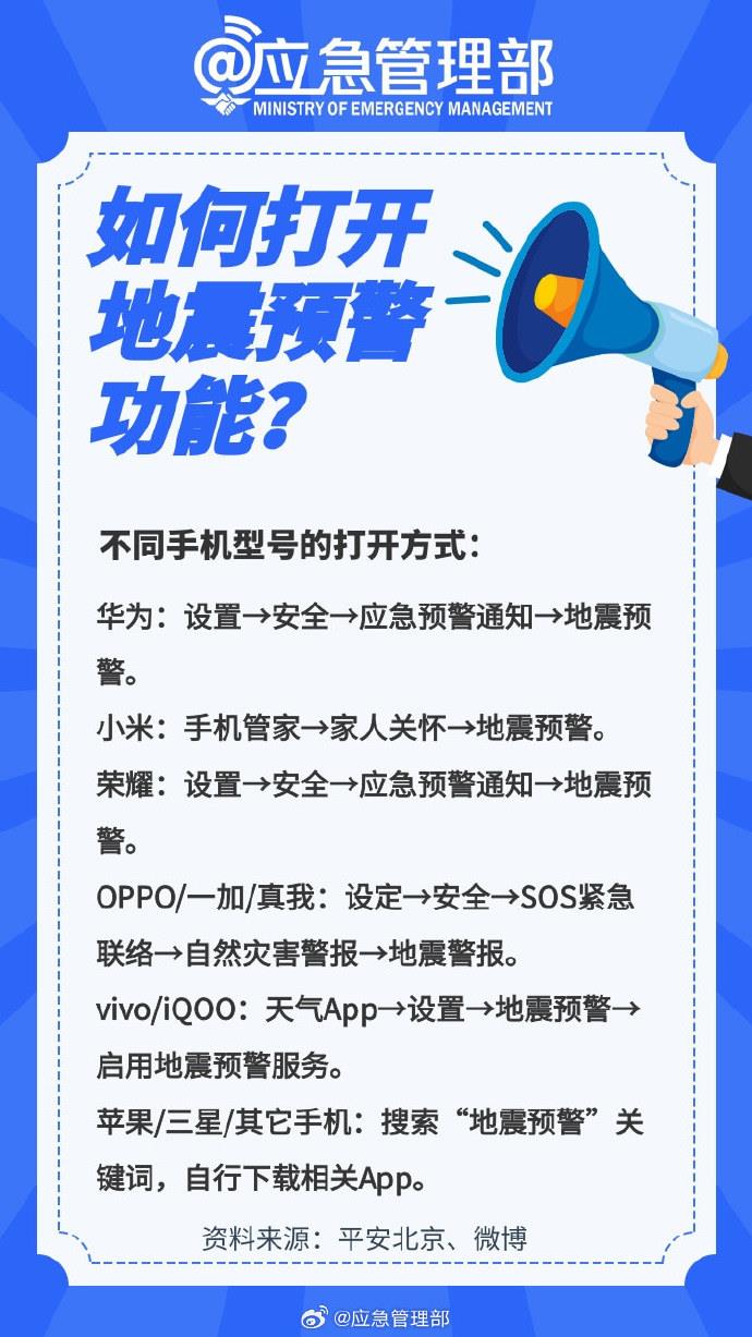 8月6日2时33分,山东省德州市平原县发生5.5级地震,不少网友反馈收到了地震预警。地震预警功能非常重要,在紧急时刻,这提前一分钟的预警,给了我们紧急避险的宝贵时间。那么,手机上怎么设置地震预警?不同手机型号可以参考下面的方法↓↓↓防患于未然,仅需十秒钟,请大家都打开地震预警功能!希望所有人平安!