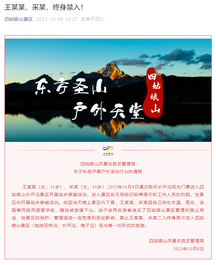 王某某(女,31岁)、采某(女,41岁),2023年10月8日通过购买长坪沟观光门票进入四姑娘山长坪沟景区开展徒步穿越活动,进入景区后无视标识标牌提示和工作人员的劝阻,在景区内开展徒步穿越活动。后因当天晚上景区内下雪,王某某、采某因自己存在失温、高反、迷路等风险而报警求助,随后被救援下山。由于该两名游客违反了四姑娘山景区管理的禁止规定,给景区的保护、管理造成一定危害和恶劣影响。禁止王某某、采某二人终身再次进入四姑娘山景区(包括双桥沟,长坪沟,海子沟)观光等一切形式的旅游。