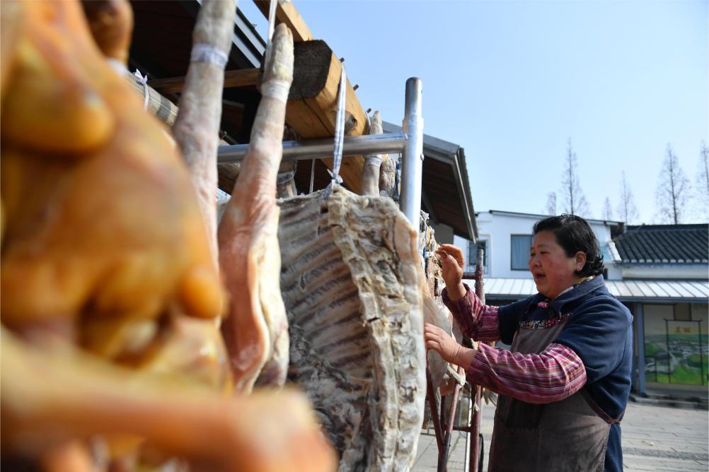 1月9日,在江苏省昆山市张浦镇金华村,村民晾晒腊肉。新华社记者柳文惠 摄