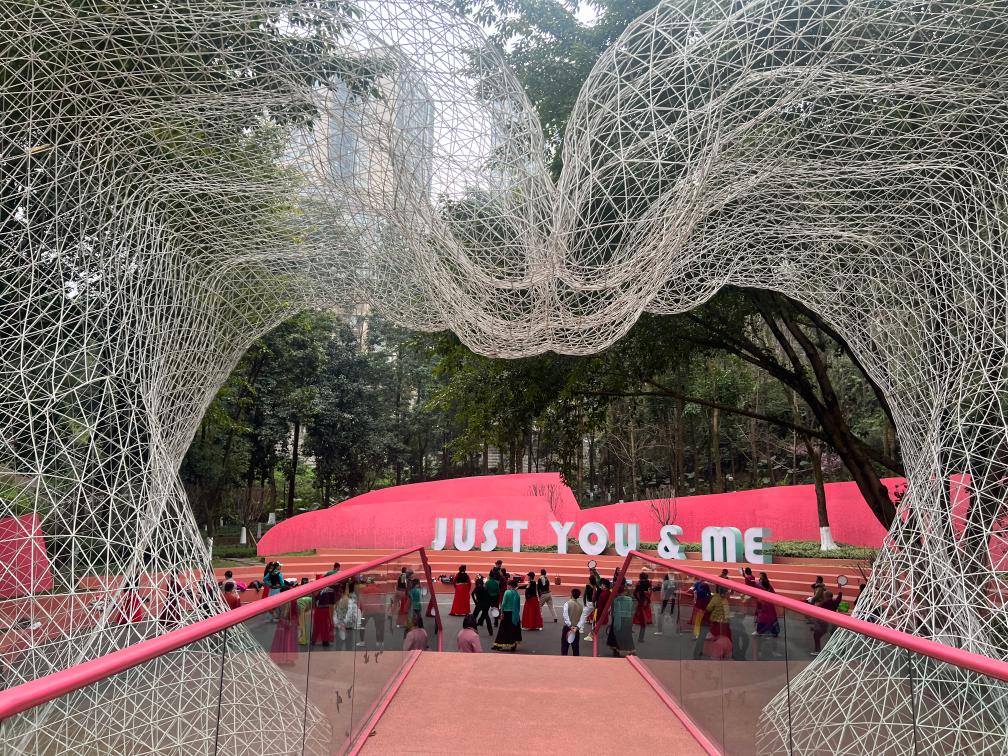 位于八桥镇的爱情公园,近日在社交平台上成为新的热门“打卡点”。这里原本只是周边小区的配套绿化区,大渡口区城市管理局在2023年以“爱情”为主题对其进行了改建。行走其间,各处粉色、紫色的景观陈设,被修剪成爱心形状的树木,“双手捧心”的鹊桥等,时刻提醒着游客公园名字寄托的美丽意蕴。