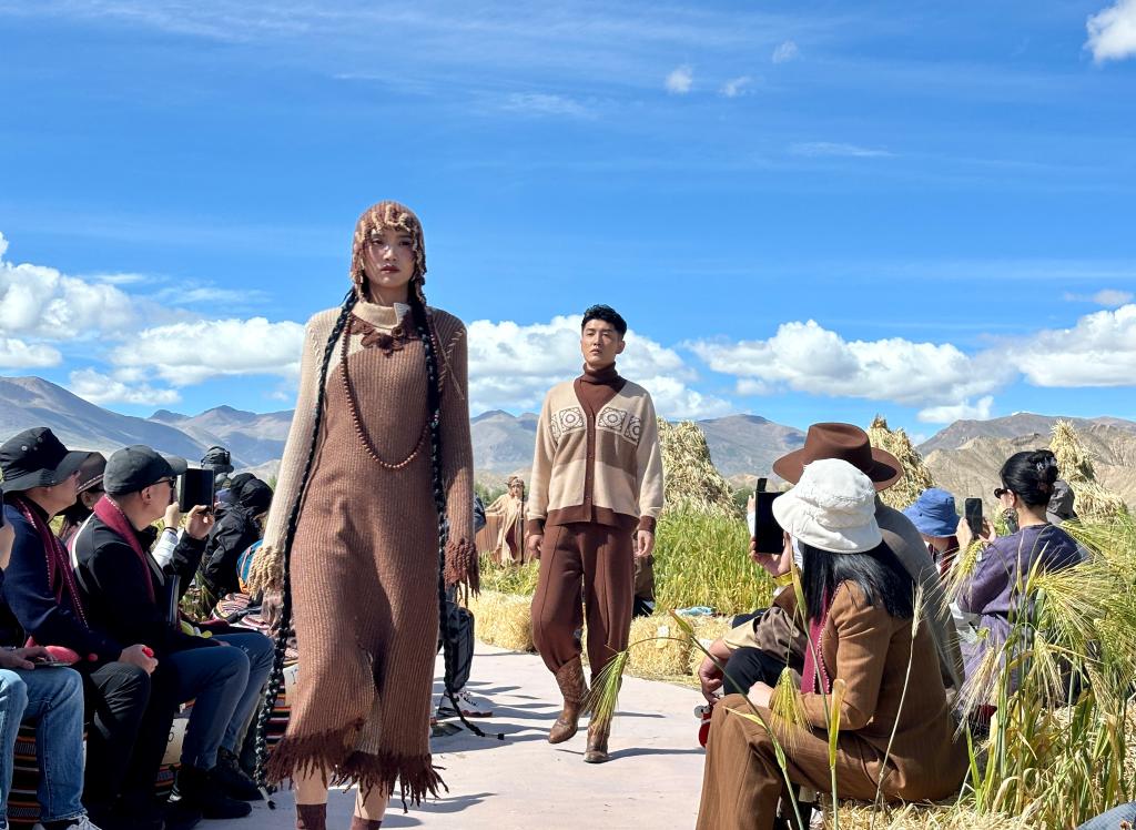 新华社拉萨9月9日电(记者王辰阳、丁汀)高原山脚下、青稞麦浪中,氆氇摇身一变成为时尚服饰,在海拔约4000米的秀场上吸引了现场中外嘉宾和线上观众的关注。9月8日,一场以“雪域·交响”为主题的发布秀在西藏江孜县班觉伦布村举行,现场不仅有身着氆氇时装的专业模特现场走秀,还有30位氆氇手工匠“阿佳”(藏语意为大姐)在T台旁展示梳毛捻线等工序,氆氇纺织机声与钢琴独奏交错相生。