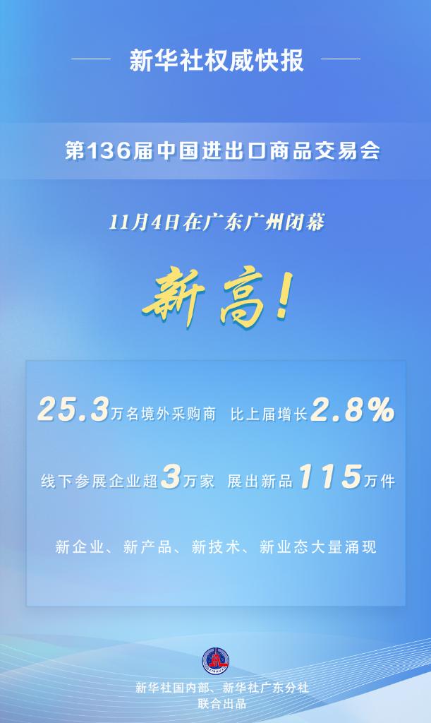 第136届中国进出口商品交易会11月4日在广东广州闭幕。自10月15日开幕以来,截至11月3日,共有来自214个国家和地区的25.3万名境外采购商到会,比上届增长2.8%,首次突破25万大关,创历史新高。