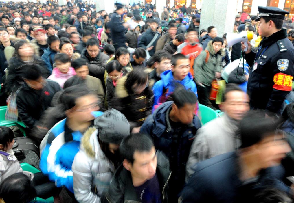 2009年1月22日,旅客在北京站候车室排队进站乘车。当日,北京站进入春运最高峰,上下车旅客达33万多人,创历史最高记录。
