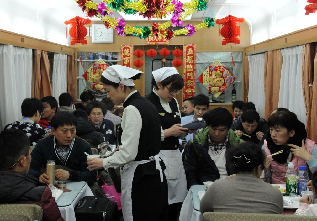 2015年2月24日,京沪车队一组餐车服务人员在上海至北京的T110次列车上为就餐旅客服务。