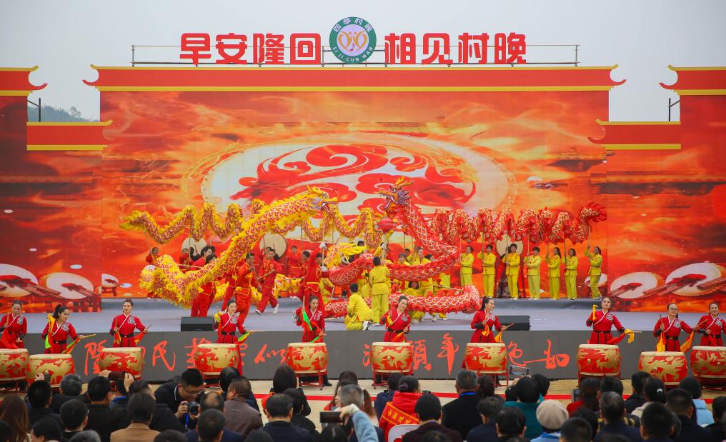 广场上,舞龙队的彩龙腾空而起,游走在人群中,引来阵阵惊呼;十几位演员手持彩绸在广场中央翩翩起舞……村民们纷纷拿出手机,记录下这一欢乐时刻。