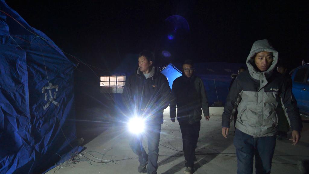 1月8日凌晨,“震后第一夜”古荣村党支部书记次仁平措在安置点巡逻。新华社记者 洛卓嘉措 摄