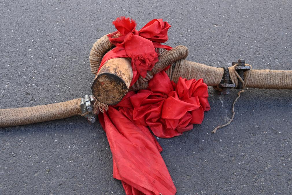 这是2月10日在临潭县城关镇西大街万人扯绳活动现场拍摄的用于连接钢绳的木杠。新华社记者 范培珅 摄