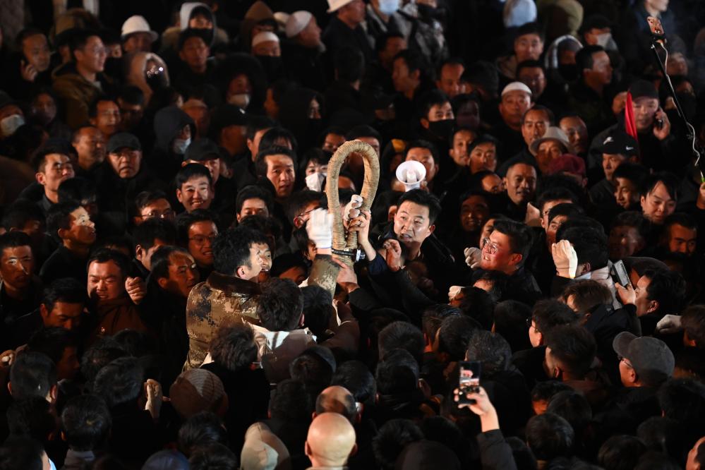 2月11日,在临潭县城关镇西大街,群众参加万人扯绳民俗活动。新华社记者 范培珅 摄