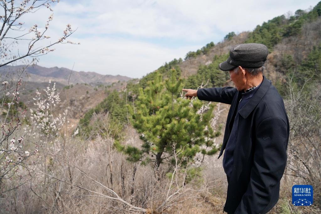河北省平山县南段峪村村民、雷烨希望小学退休教师王海军指认雷烨烈士牺牲处的山谷(2025年3月31日摄)。新华社记者 牟宇 摄