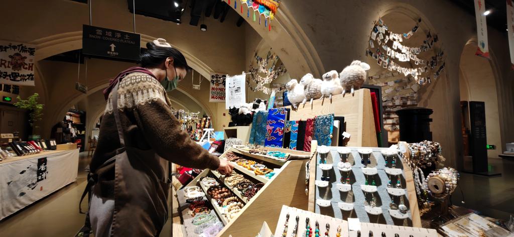 7000多平方米的空间里,处处展现着西宁多民族文化共融共生的特点。“雪域净土”区域藏香袅袅,来自牧区的牦牛绒制成围巾、羊毛毡变身杯垫、土族盘绣装饰在电脑包上,380余种民族手工艺品,生动展示书本之外的雪域文化。