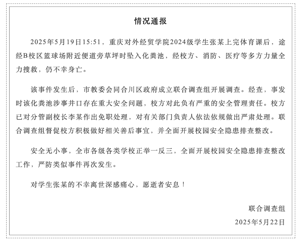 通报称,2025年5月19日15时51分,重庆对外经贸学院2024级学生张某上完体育课后,途经B校区篮球场附近便道旁草坪时坠入化粪池,经校方、消防、医疗等多方力量全力搜救,仍不幸身亡。