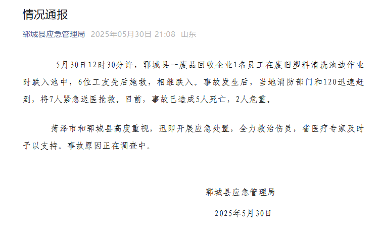 5月30日12时30分许,郓城县一废品回收企业1名员工在废旧塑料清洗池边作业时跌入池中,6位工友先后施救,相继跌入。事故发生后,当地消防部门和120迅速赶到,将7人紧急送医抢救。目前,事故已造成5人死亡,2人危重。