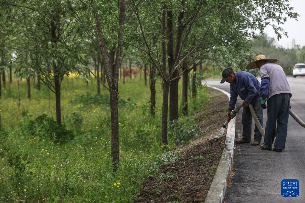 6月5日,工人在抚顺西露天矿综合治理生态园为植被浇水。新华社记者 潘昱龙 摄