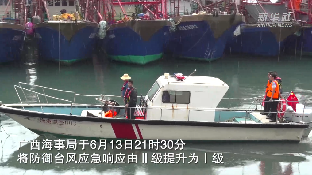 广西海事局于6月13日21时30分将防御台风应急响应由Ⅱ级提升为Ⅰ级。在侨港镇电建渔港码头,记者看到各类渔船整齐停泊。