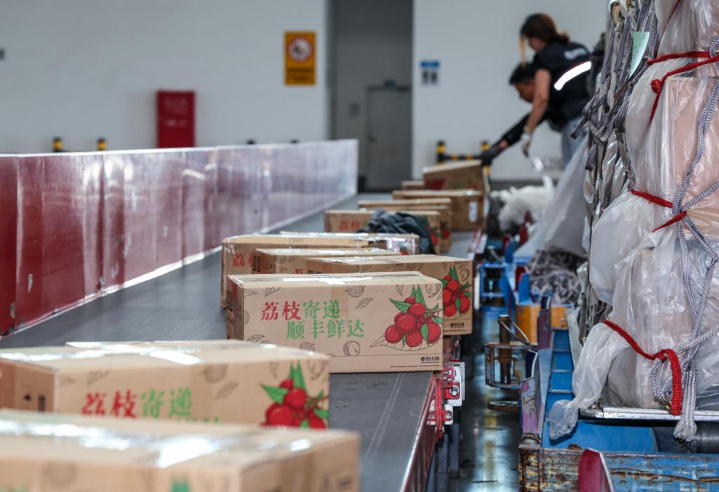 6月29日,在西安咸阳国际机场,工作人员对荔枝快件进行分拣。