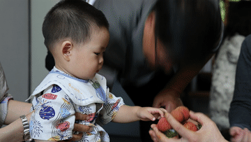 6月29日,在西安建筑科技大学,一位市民准备品尝来自广州的荔枝。