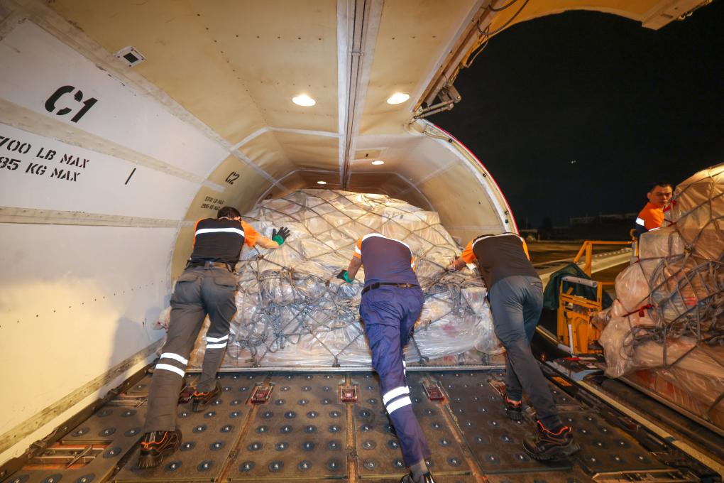 6月29日凌晨,在广州白云国际机场全货机专用停机坪,工作人员将荔枝快件组板装载进货仓。