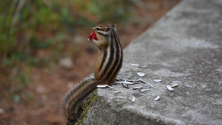5月20日,五营红松林海景区内松鼠正在觅食。张启明摄