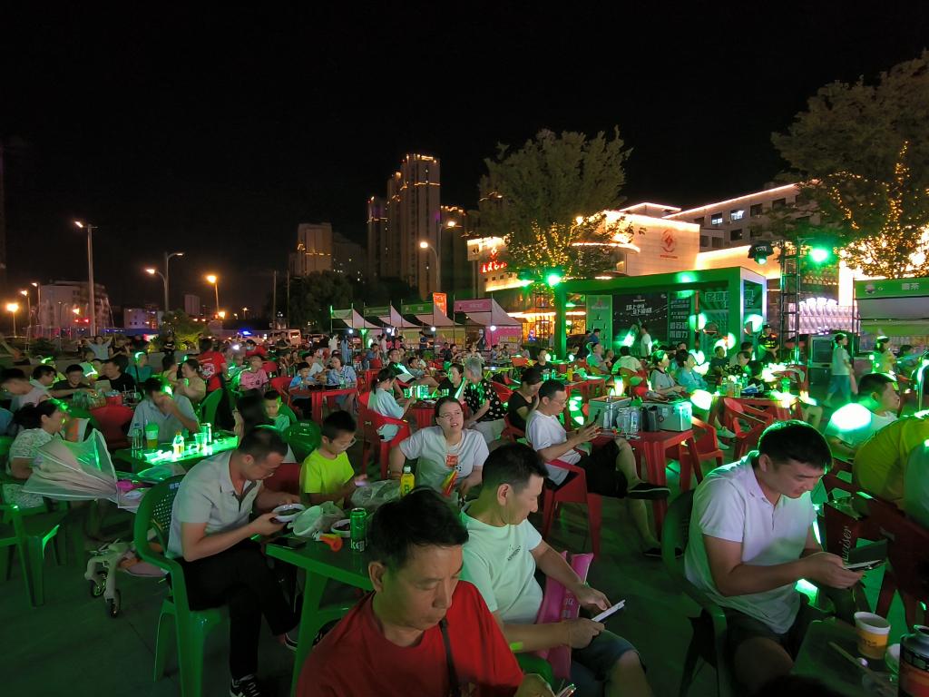 在位于无锡市滨湖区的湖滨商业街东广场,人们边看球边品尝美食。新华社记者 何磊静 摄