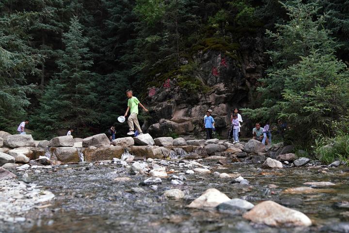 7月11日,游客在焉支山瑶池赏景游玩。 新华社记者马宁摄